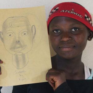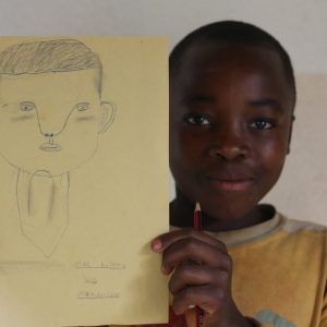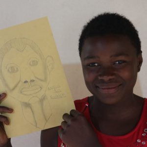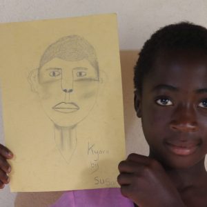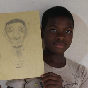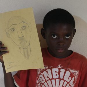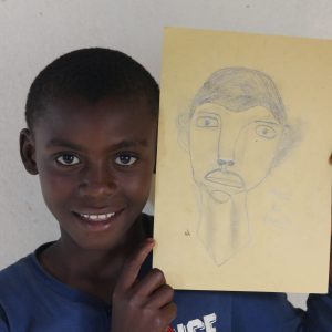 We did these art workshops for a week, assisted by Godwill. We did classes on story writing, on drawing and origami. The session that felt most successful was the day we let the children draw portraits of each other. We first let them draw a face in the empty shape of a face. And knowing there would be many mistakes, we knew we would have a lot to laugh about. Then we used the inevitable mistakes to show them how counterintuitively the proportions of a face really are.